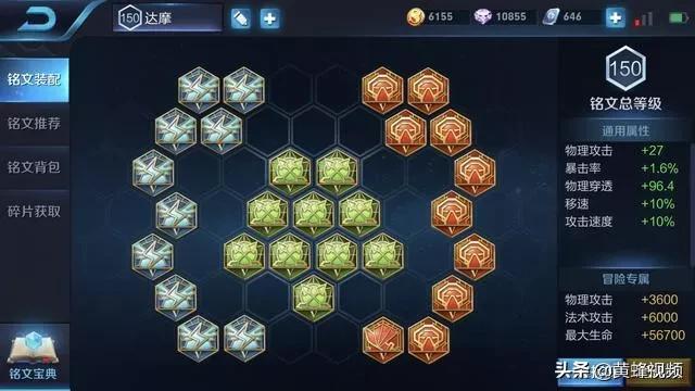 达摩的铭文选择:10狩猎、10鹰眼、9异变、1祸源,技能带闪现。10狩猎,提高攻速和移速,这是必备的;10鹰眼和9异变加攻击和穿透,1祸源是增加一点暴击率,人品好的会打出高额伤害。