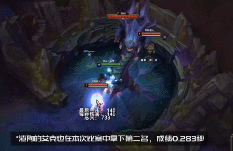 很快,“Super”向我们揭晓了另一个答案,艾克。艾克的被动可以对野怪造成300%的伤害,被动伤害AP加成高达0.8,R技能更是1.5的恐怖数值。时间来到55秒时,他在敌方高地放出Q技能后瞬移回大龙坑,2秒后提前使用一段E技能,触发丛刃以提高二段E技能的出手速度,然后关闭假人再用R技能,艾克回到大龙处,大龙被挂上一层被动。“Super”立刻打出二段E技能并触发巫妖之祸,大龙身上两层被动,此时在高地释放的二段Q技能归来,艾克的三层被动触发,大龙血量从6000瞬间归零。“Super”只用了0.35秒,一度把时间提升到了无法企及的高度,然而“渣狗zz”进一步优化了操作,将时间降低到0.283秒,只用了17帧的他跻身榜单第二名!