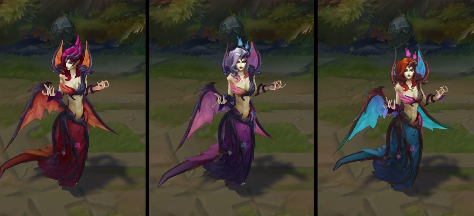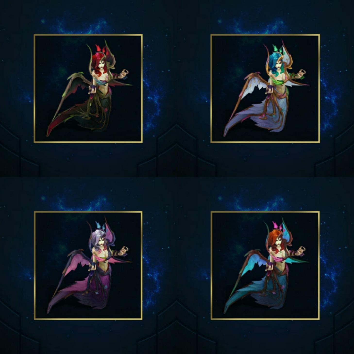 然后黑色荆棘莫甘娜这款皮肤重做后就是全特效了,技能里会有比较多的落叶和荆棘特效,炫彩皮肤总共有四款,粉色的马樱丹尤其推荐。