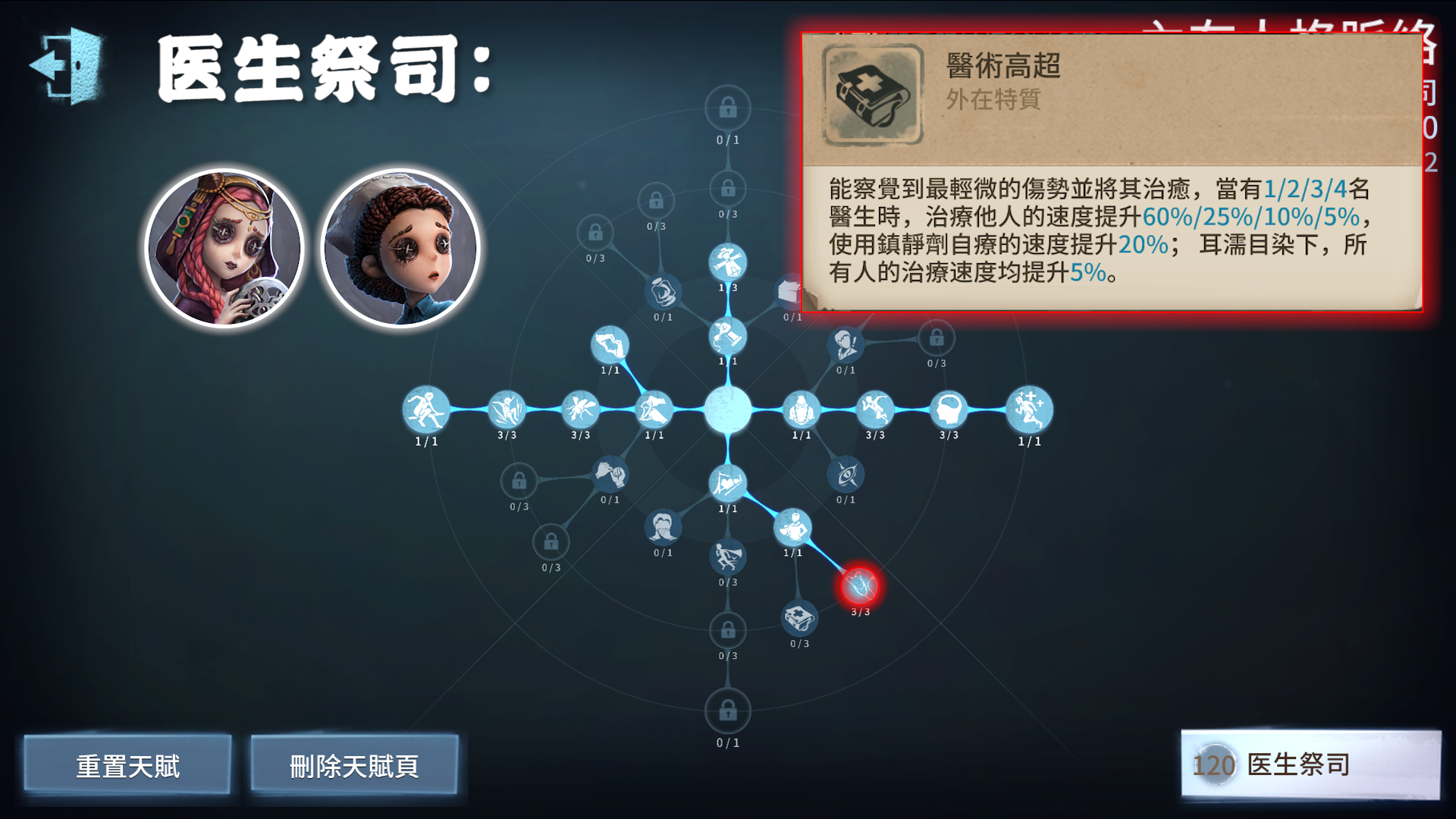 然后再结合角色自身的特质点出小天赋,比如像医生祭司自身有治疗加速,那可以点出三层医者强化该效果!