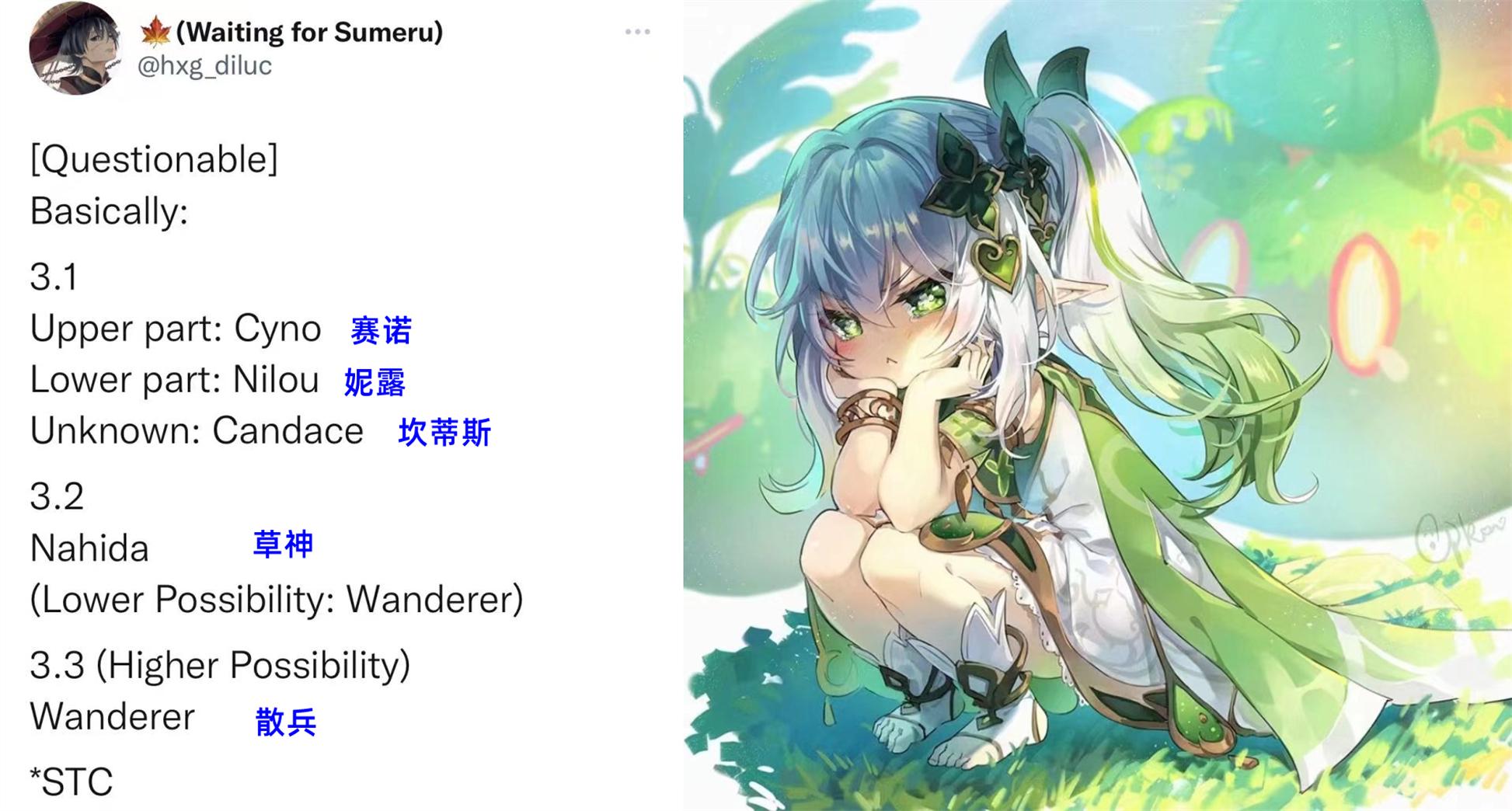 须弥前三个版本会实装的新角色大致已经明了,甘地舅近日总结了新角色的具体时间:3.1上半是五星雷系长枪角色赛诺,下半是五星水系单手剑妮露,至于四星水系长枪坎蒂斯只知道会在3.1,不确定上半还是下半;3.2版本则是众望所归的草神,同版本小概率还有散兵;而散兵更可能(大概率)在3.3版本实装。