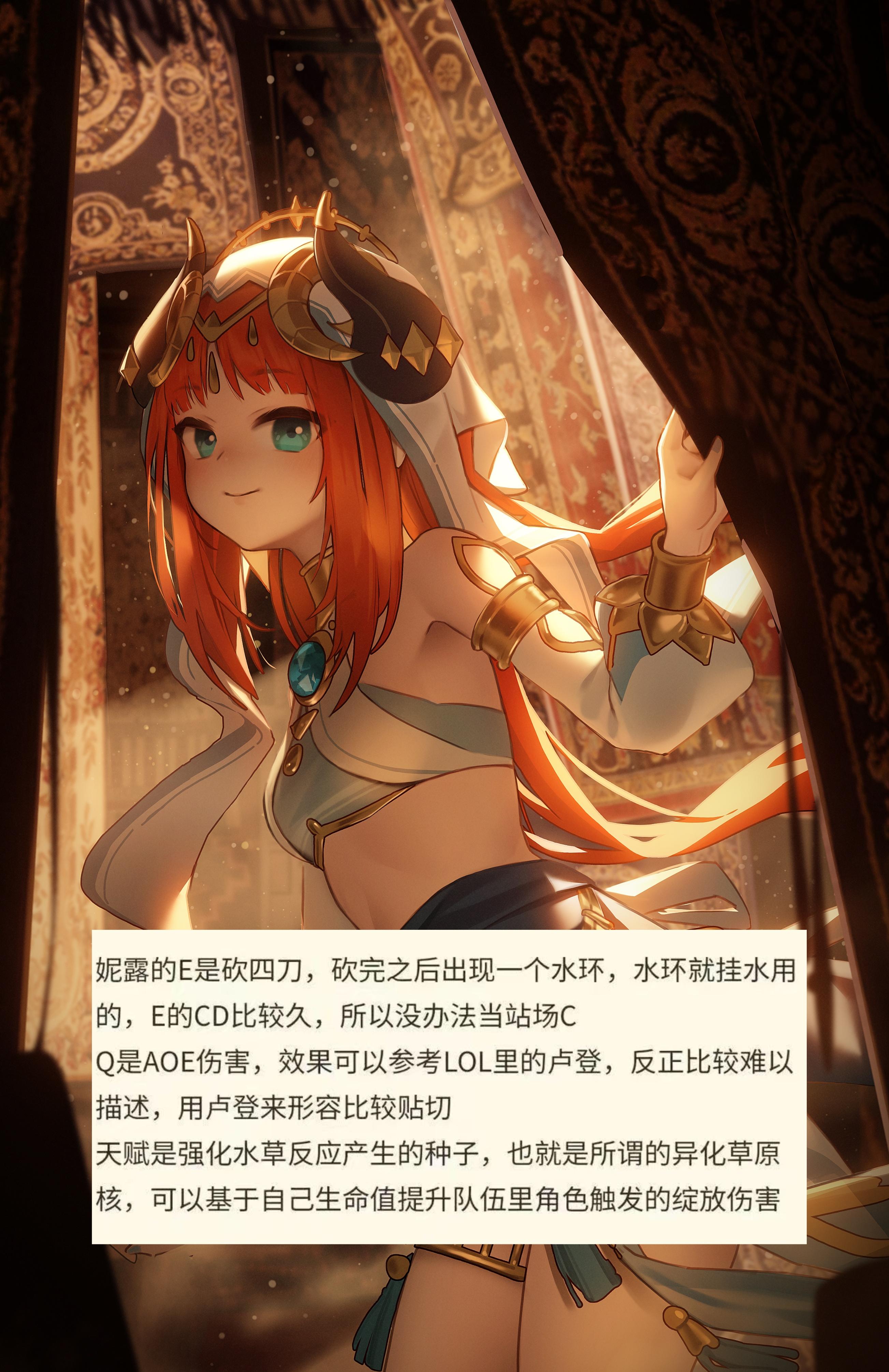 可能是部分玩家听到技能组后对妮露的强度产生了质疑,以至于甘地舅拿妮露和八重比较进行了一波锐评,认为妮露比八重要好一些,至少妮露释放四段e的过程中有伤害但八重没有。个人认为如今下结论还是太早了,关键要看妮露的定位是什么,如果是速切副C的话,4段e的时间太长,再加上如果伤害不算高的话是会遇到类似八重神子的问题。不过两人的不同点在于妮露是元素反应核心的水系,而且也没必要强求妮露是个输出爆炸的角色,当个能提高队伍上限,并且还能跳舞的辅助不也挺好嘛~