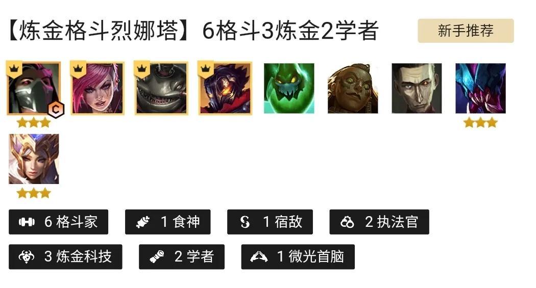 云顶新版本更新至今有一个阵容现在就是毒瘤存在,这个阵容就是【炼金格斗烈娜塔】6格斗3炼金2学者。