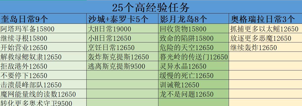这是小探给大家推荐的25个高经验日常任务,大家可以抽空先做好,WLK开放后就立马前去交任务,总共获取33万经验值,才不多可以升小半级,然后一步快步步快,最终节约不少时间。