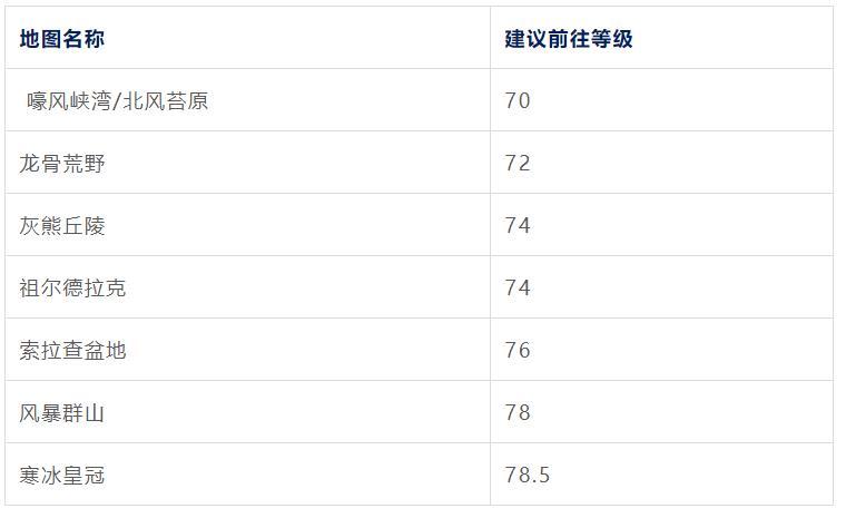 综合一下,小探推荐的升级路线为:70~72级完成嚎风峡湾/北风苔原+魔枢;72~74完成龙骨荒野+古代王国副本任务;74~76级完成祖尔德拉克+古达克副本任务;76~77级完成索拉查盆地,并顺便学习寒冷飞行;77~78级完成霍迪尔之子任务线;78级之后完成寒冰皇冠任务线(WLK版本主任务线)。