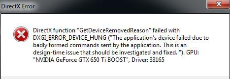 弹窗错误,错误内容为"DirectX Error" 具体详情为下图