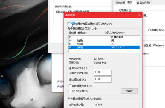 先将自动管理取消掉,在你放爹1的盘那里,比如我的游戏盘,因为默认是2个g的虚拟内存,而我们需要更大,我们用自定义大小来输入你想要的虚拟内存大小,我这里给了5个g