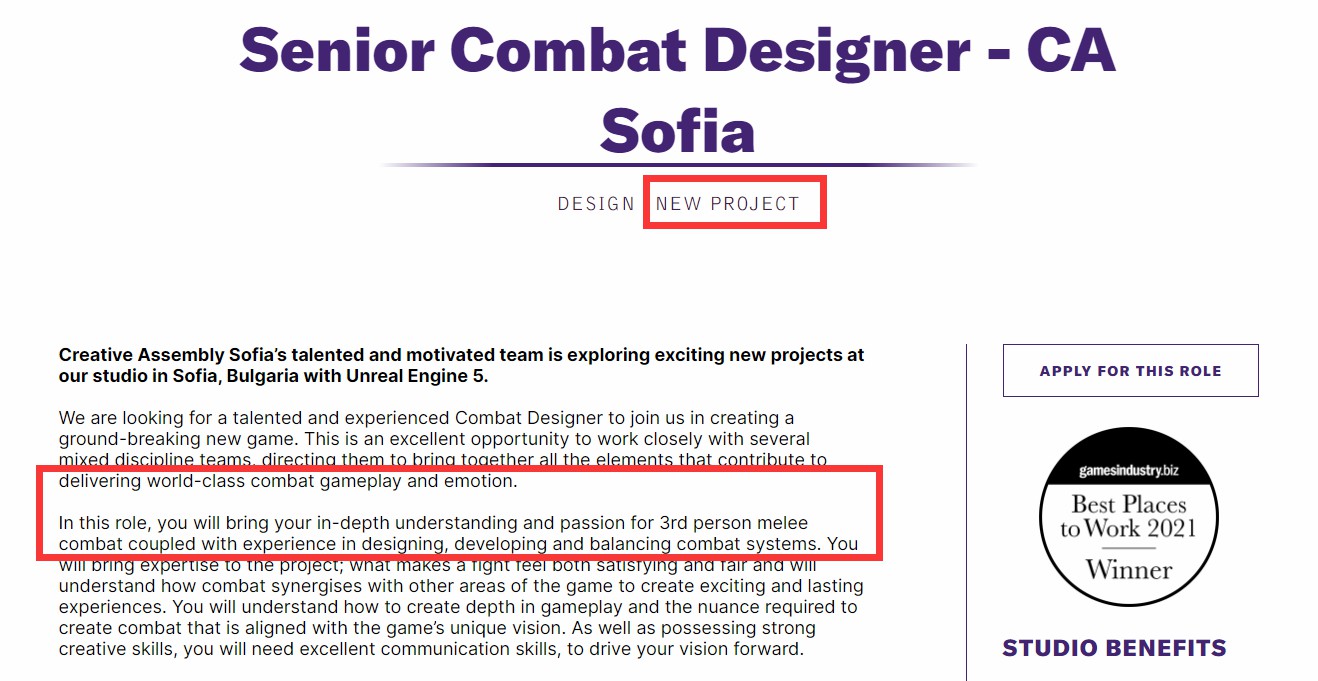 根据Creative Assembly新招聘信息显示,该公司正在开发一个第三人称动作近战战斗新作,使用UE5引擎制作。