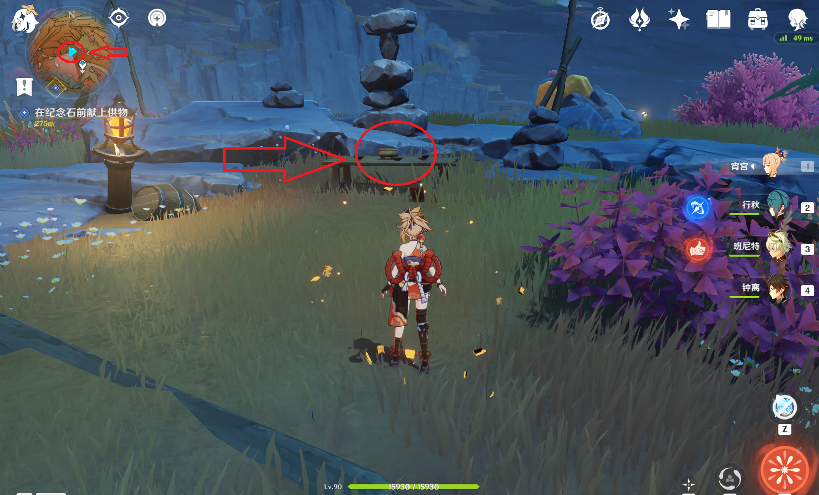 第二件供物,岁时之冕。这件供物因为在地面,也是可以在跑图的过程中完成的,位于地面矿区右边的传送点附近。参照物是几块大型的岩元素共鸣镇石,如果实在找不到位置,就记住在传送点的左上方一段距离就行。供奉物就放在上图中的桌子上面,并且由一个盗宝团成员看守着,我们击败盗宝团成员之后,就可以调查桌子拿到岁时之冕。