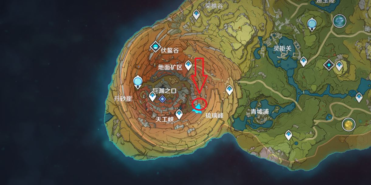 第六件供物,同泽之枪。这件供物就在接取任务的地点附近,打开大地图我们可以看到“天工峡”三个字的地名标注,地名的正上方最高处的山崖上,就是同泽之枪的位置了。这个地方很容易攀爬,基本上没有什么难度,我们可以从巨渊之口的传送点出发,也可以从天工峡的传送点出发,就看你自己觉得哪里近了,路上的共鸣岩记得解下谜,有宝箱拿哦~