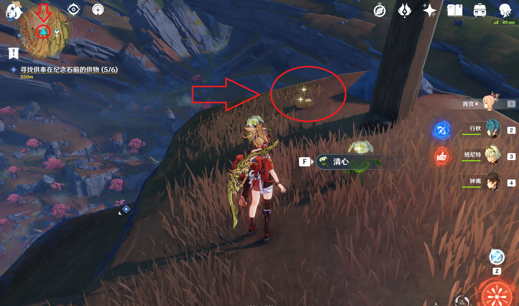 第四件供物,远眺之花。这件供物也是位于山峰的最高处,我们先传送到巨渊之口左侧的七天神像,然后向左下方的丹砂崖前进就行了,一路上通过可以攀爬的位置尽量往高处爬。到达丹砂崖的最高处之后,我们会发现一个自称是古华派传人却穿着盗宝团服饰的人,在他的面前有几株清心,调查之后就能获得远眺之花,同时还能在这个人那里接到另一个支线任务。