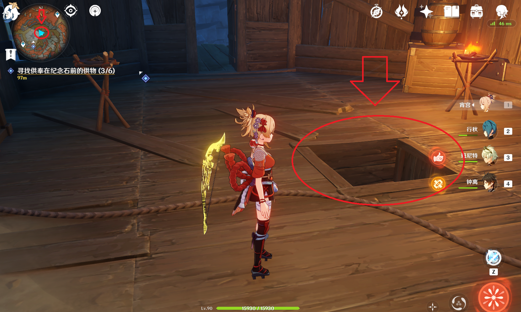 第五件供物,庇佑之冠。传送到巨渊之口的传送点之后,朝下看可以看到一间很大的木头房子,进入房子之后到达最下面的一层。进入之后,会发现这里像一个小小的密室,地面有一堆干草垛,我们用火元素点燃草垛之后就会出现一个暗格,庇佑之冠就藏在这个暗格里面了。拾取供物之后,会有盗宝团成员想要夺取,打败他之后也可以接取另一个支线任务。