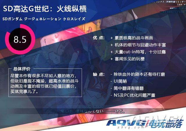 如果你喜欢UC系之外的高达,那么《SD高达G世纪 火线纵横》实在是一款不容错过的佳作。尽管本作有很多不尽如人意的地方,但依旧是瑕不掩瑜,超高水准的战斗动画及丰富的细节就已经值回票价,买就完事儿了。顺便衷心希望财团B以后在跨平台上多走走心,不要让一款本应该得到好评价的作品栽在那些低级乌龙BUG上。