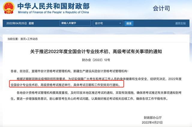 根据近期新冠肺炎疫情防控形势要求,为切实保障广大考生和考试工作人员的身体健康和生命安全,经研究决定,2022年度全国会计专业技术初、高级资格考试推迟举行,具体考试日期和工作安排另行通知。