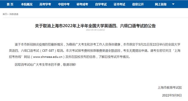 5月9日,上海市教育考试院发布消息,上海原定于5月21日至22日举行的全国大学英语四、六级口语考试(CET-SET)取消。本次考试报考费将按原缴费渠道全额退回,考生无需提出申请。