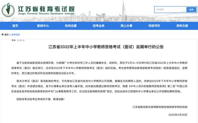 原定于5月14日—15日举行的江苏省2022年上半年中小学教师资格考试(面试)推迟举行,合并至2022年下半年中小学教师资格考试(面试)组织实施。考生报考费用由教育部教育考试院统一按原渠道退回,退费的考生,其已通过的笔试科目成绩有效期自动延长半年。