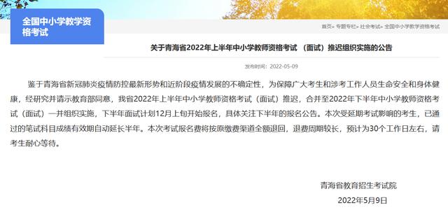 5月7日,辽宁省教育厅明确,原定于5月14—15日举行的辽宁省2022年上半年中小学教师资格考试(面试)推迟举行,与2022年下半年中小学教师资格考试(面试)合并。