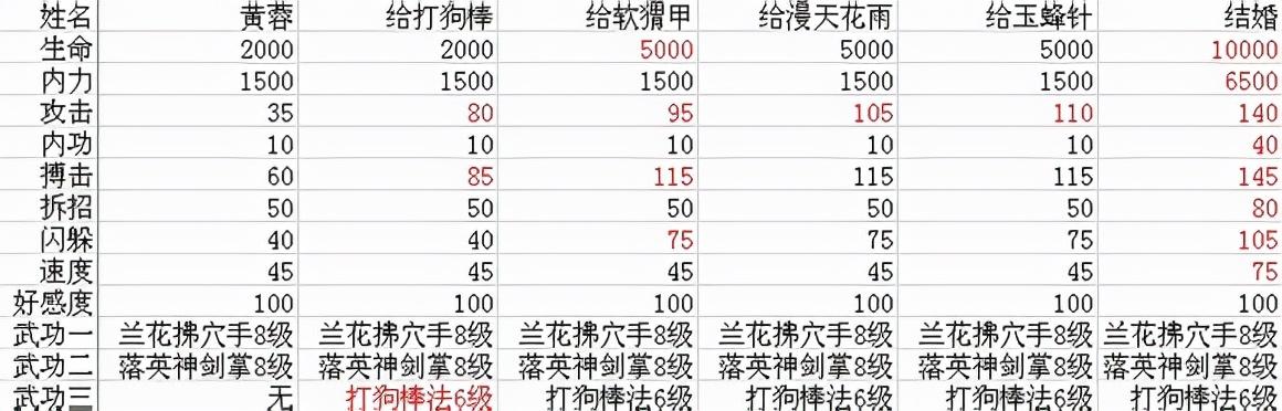 队友五:黄蓉。加入方式与难度:入门派前,在牛家村的破庙遇到乞丐打扮的黄蓉,给她买吃的,十次以上即可。然后门派出师后回牛家村(无门派直接可以回牛家村),在河边碰到黄蓉,即可加入。武当的就没办法加了。培养难度:难。打狗棒可以做“闯王宝藏的秘密”获得,或者做“神雕侠的三件礼物”然后贪下打狗棒;软猬甲黄蓉加入时自带;漫天花雨华山派的可以在华山剑宗学到;少林的可以在南少林得到,其他门派得不到;玉蜂针古墓的可以在和小龙女切磋时得到,其他门派可以找铁匠打造(几率比较低)。初始属性:一般。60的搏击算初始人物中较高的。完成培养后:强。由于女性角色可以通过结婚来大幅提升属性,因此普遍比男性队友厉害。黄蓉是值得结婚的几个女性队友之一。缺点嘛,就是没有群攻技能。