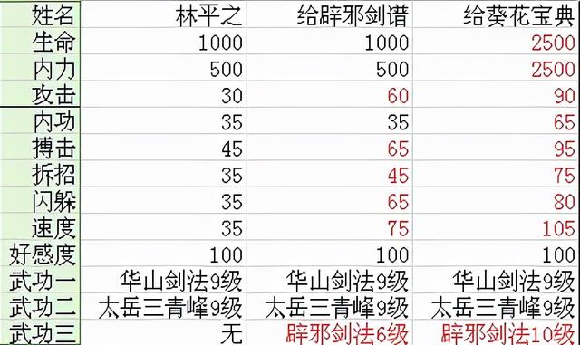 队友三:林平之。加入方式与难度:只有华山派才能加到,在华山时找他切磋提升好感下山时就能带他一起下山了。一般。培养难度:一般。辟邪剑谱是在林家老宅打败蒙面人获得,葵花宝典征服日月神教即可。初始属性:一般。完成培养后:较强,攻击搏击速度都很高,辟邪剑法出招快,单体伤害很高,不过林平之的硬伤是血太少了。实力:四颗星。评价:华山路线的话可以考虑加他,不过自己就学不到辟邪剑法了(不过问题不大,因为学辟邪剑法和葵花宝典都需要自宫,我反正都不学,想学的可以在结婚后再学,不然就不能结婚了)。不过游戏中比林平之厉害的队友还有好几个,因此放弃也不可惜。