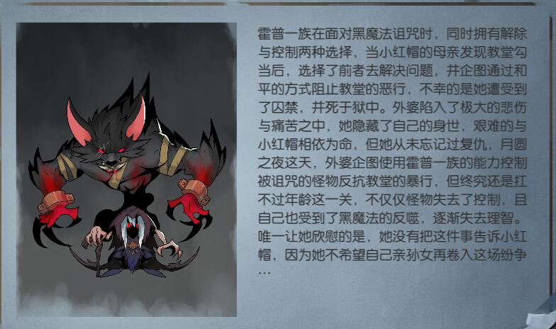 除了小怪的插曲外,游戏中的每一个BOSS都有着自己的故事,在游戏结束后玩家可以在成就系统中自行查看,在众多BOSS中有一个故事让笔者很是以外,那就是神秘人这个boss没想到她就是我们游戏中一开始的终极目标外婆,因为字数较多这里就不写出来了,大家直接看图。