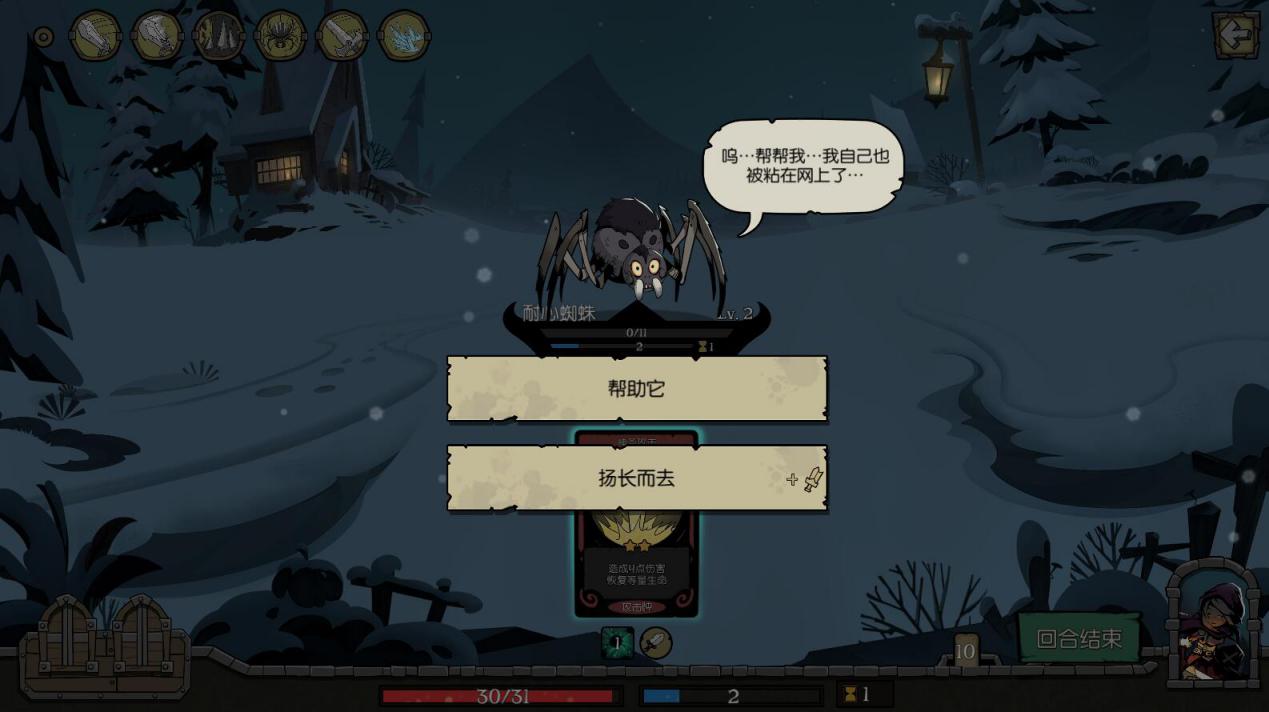 在之前介绍中说过,《月圆之夜》这款游戏中每一个NPC和BOSS都有着自己的故事。在非噩梦难度下击败个别敌人还会触发一些剧情,笔者印象比较深刻的就是一只粘在蛛网上的蜘蛛,没错自己把自己粘在蛛网上。打败这个二货蜘蛛后,它就会让玩家帮助它脱离苦海,笔者作为一个乐于助人的新时代好青年,肯定义无反顾的帮助它啦,没想到它猛一回头咬我一口就跑了!这一口咬的我那叫一个印象深刻。