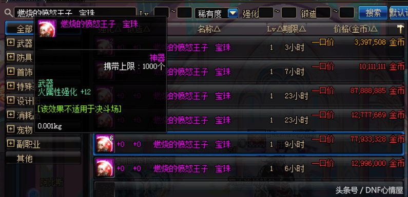 燃烧的愤怒王子,这宝珠也是附魔武器部位,不过这宝珠的属性是附魔火属性强化12的宝珠,对于走火强的百分比职业,这提升也比较大。而且,这宝珠在拍卖行也仅仅只卖1000多万,这么实惠的宝珠,恐怕在游戏中并不多见。