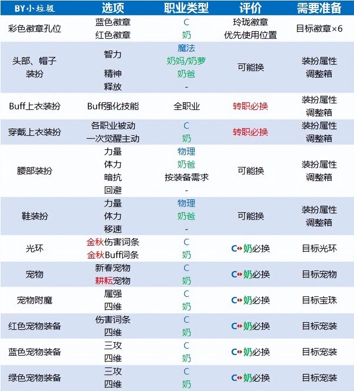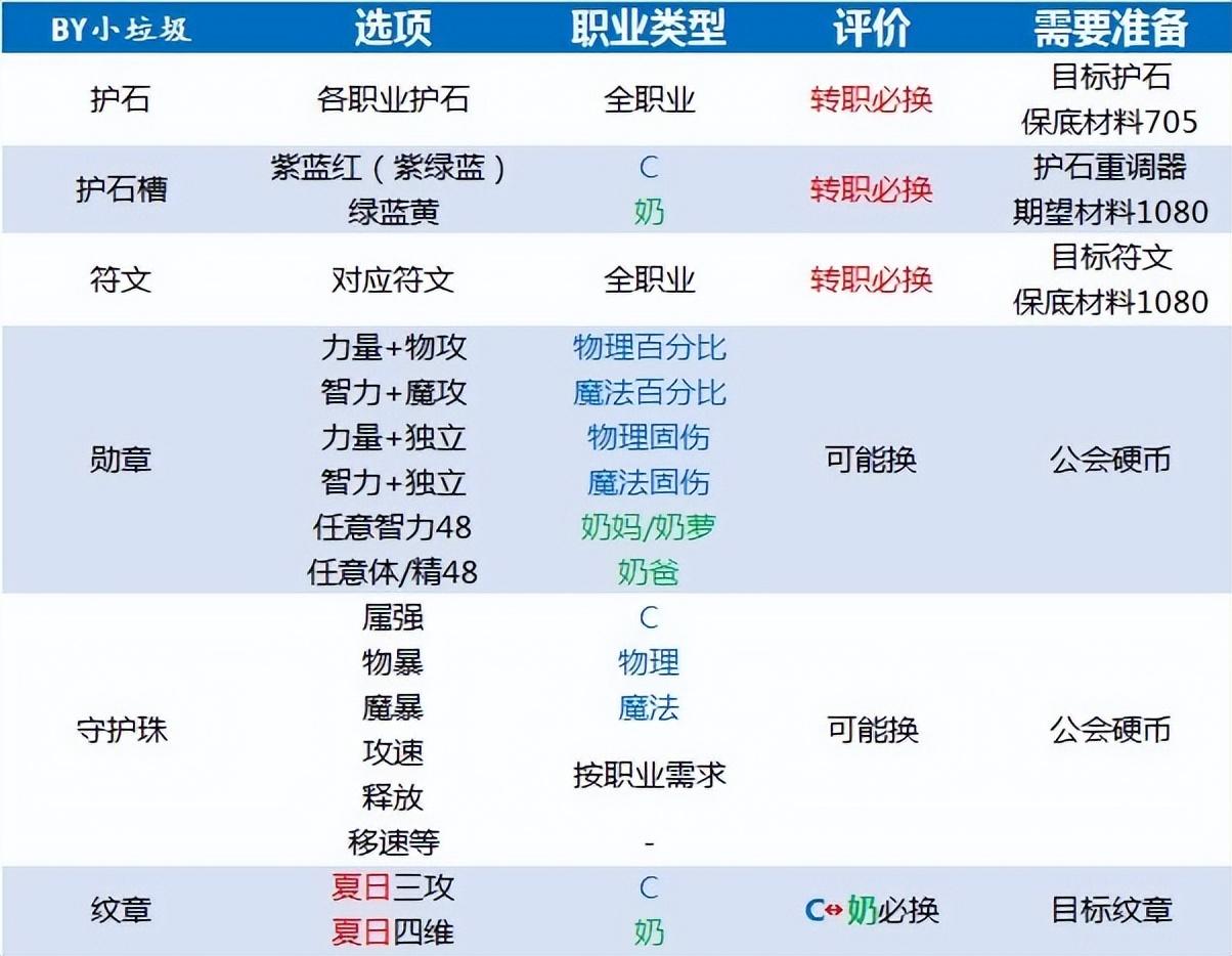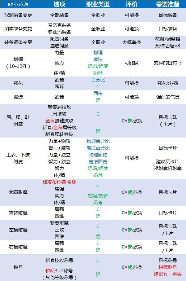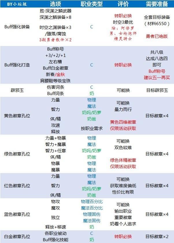 成本是否值得?根据上文表格内容,转职必更换的内容成本虽然不低(主要是宝珠、白金、Buff称号),但以打团标准为需求的眼光来看,不会带来太明显的负担,尚可接受。如果是不同类型的C之间进行转换,成本必然较夸张。建议在已配备最新金秋特色(腰带、鞋宝珠+光环)的基础上,再考虑转职问题;至于C&奶间转职,仅在高增幅成本占绝对优势的情况下,跨类型转职才具有一定的性价比。