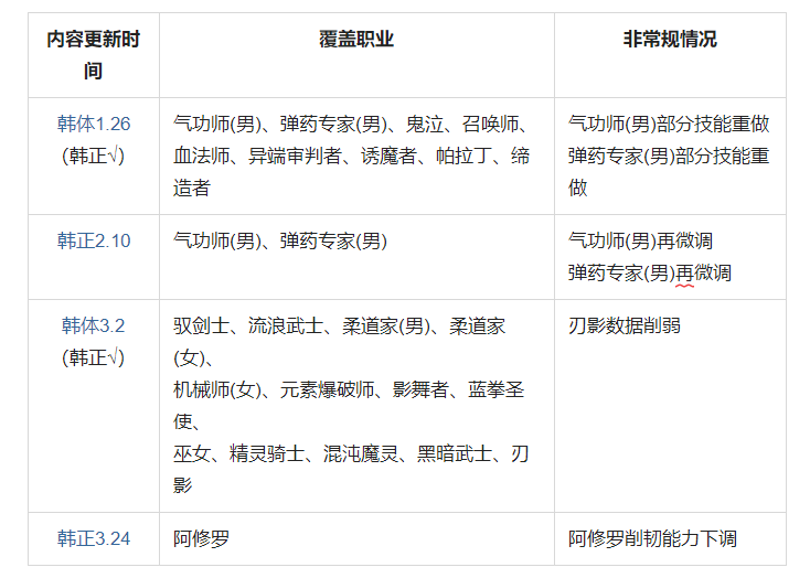 说在最前:黑暗武士和缔造者无法转职!1.综合实战表现(新春前版本)参照无名空岛的强者之路:胆魄职业榜(记得勾选总榜查看)和国服嘉年华发布的消息来看,本次第三、第四、第五周(系统奶已补正独立攻击)的前几名职业如下(第一名成绩+20s以内):第三周:精灵、影舞、刃影、散打(女)、剑魂第四周:影舞、精灵、刃影、剑魂、散打(女)、死灵第五周:精灵、刃影、散打(女)、剑魂、散打(男)、刺客、影舞备注:此时1.20新春版本改动尚未实装。1.20加强覆盖职业:流浪武士、阿修罗、死灵术士、街霸(女)、散打(女)、枪炮师(男)、枪炮师(女)、弹药专家(女)、暗刃、特工、龙骑士、缔造者、黑暗武士其他推荐阅读:2022.01.11大硕直播嘉宾谈排名——礁石222222.版本前瞻(国服未更新内容)笔者简要整理如下: