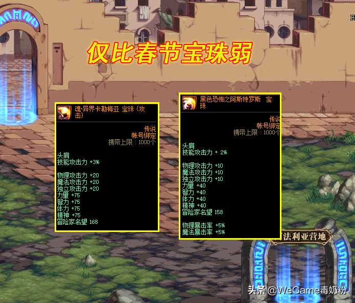 再来对比同部位的头肩附魔!论属性,只比新春特别宝珠弱一些,相当于缩水版的春节宝珠,但2%技攻宝珠也有亮点,那就是5%暴击率,对于一些很缺暴击率的职业很不错。在名望方面,那也完全够用!只比春节头肩宝珠少10点名望。