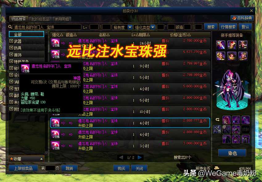 再来对比超级注水C的附魔“支援兵宝珠”,两个来源,其一是漩涡35个反物质可换,其二是拍卖行,比如50力量的“遗忘姓名的守门人”宝珠,价格高达270W金币,高下立判!如果能选择,必然是2%技攻宝珠更香啊,可问题出在了获取难度之上。