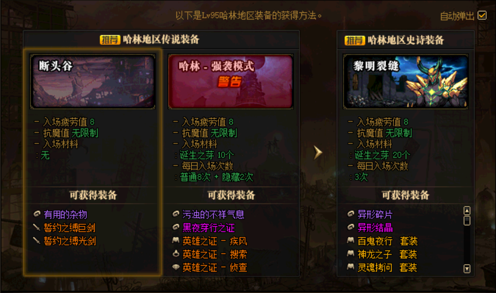 想要获得装备,深渊是必须刷的,但是深渊毕竟不能这么快的毕业,而且深渊又分为3个模式,普通深渊只能获得不可以升级的95级哈林史诗装备,不过因为是小号,因此95级我们最开始的唯一目标就是获得95级的哈林史诗装备,那么如果快速的获得哈林史诗装备呢?需要刷这一些副本获得。一个是传说装备升级,一个是材料兑换,这是比深渊更容易获取的方式。
