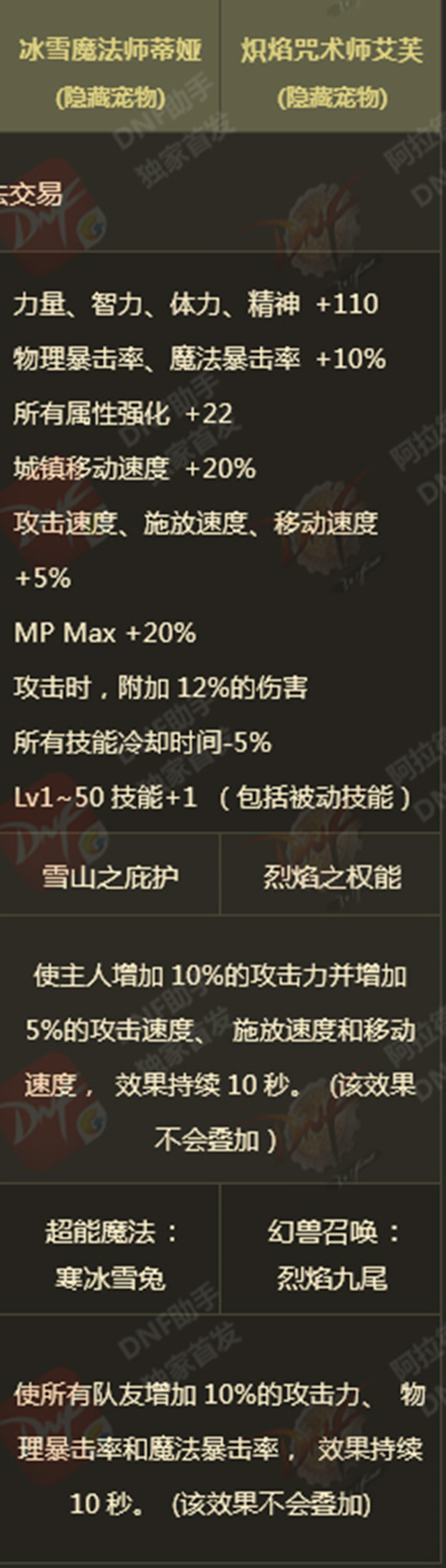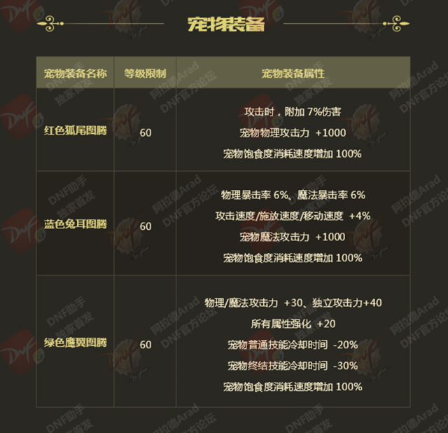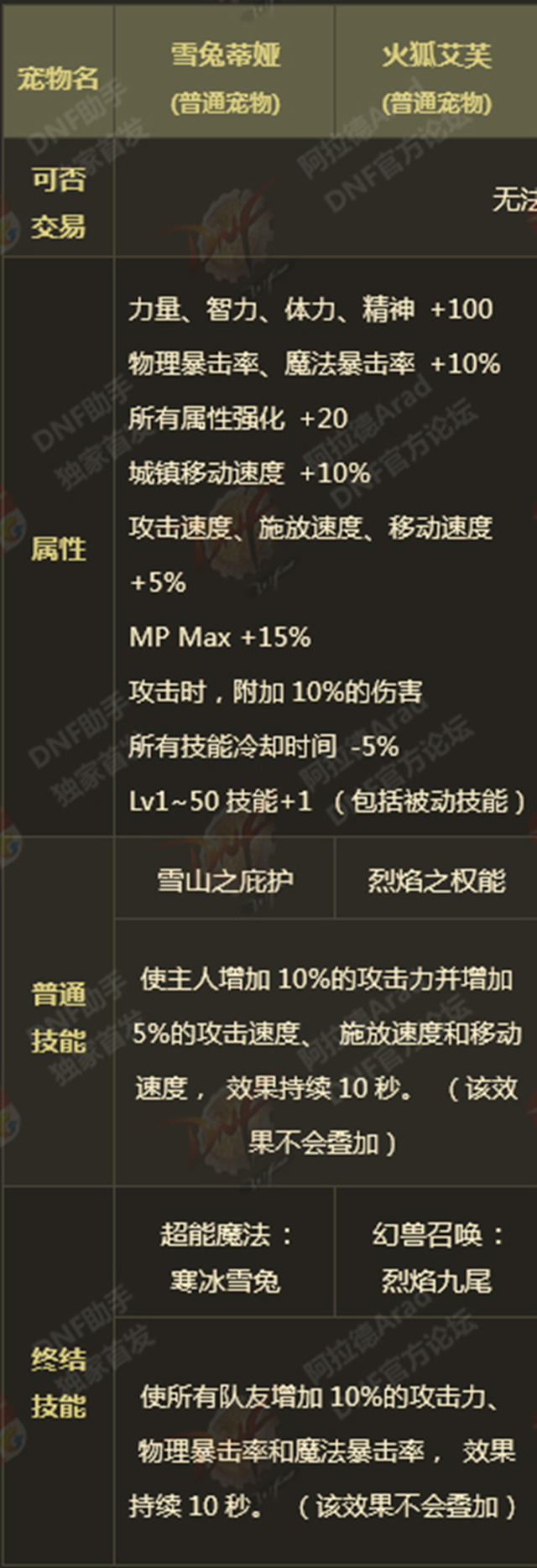 比前年的宠物多了5%的白字附加,比去年多了2%的白字附加。这只是基础属性,一看到宠物的技能,小编就知道今年的策划套路有多深,首先是增加暴击类,今年的史诗套,尤其是B套皮甲,可谓最缺暴击了,再来看看终极技能,简直就是为了促进玩家组队,再想想dnf这两年的安图恩,卢克团本,以及韩服新出的魔兽,天界Raid,都是需要玩家集结共同攻克的副本,再想到今年春节的春节活动副本,那个噩梦及的难度和卢克R足以匹敌,所以,我还是乖乖组队刷吧!