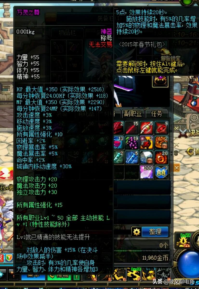 可以说2015年的春节礼包做的非常成功,也是蔡骏至此对DNF的影响,直到现在DNF的春节套三大卖点-宠物(包括宠物装备)、称号和宝珠依然是以2015年春节套为基础,不断循序渐进加强的。万灵之尊称号当年15黄字伤害,在那个年代称得上当年最强的称号。