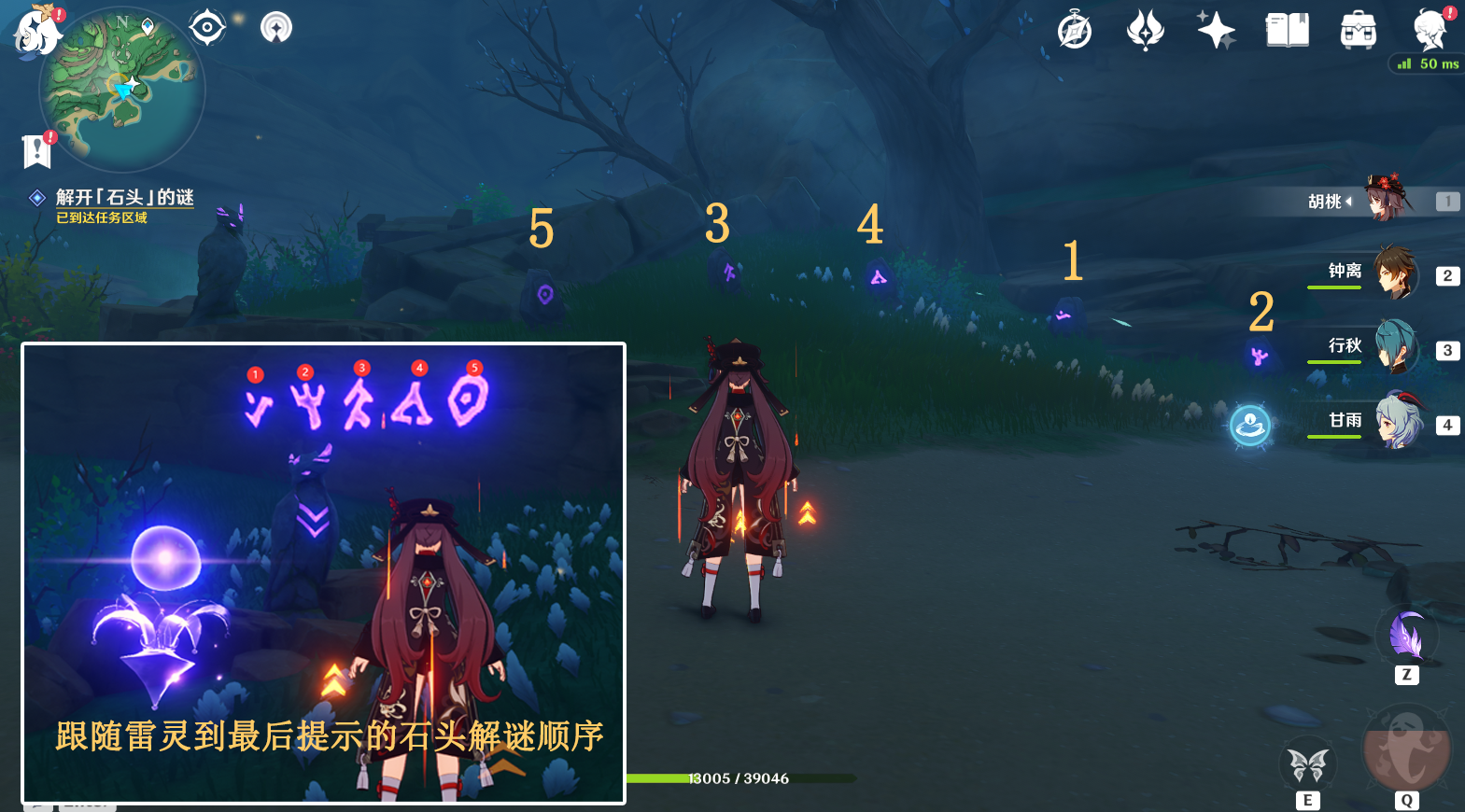 对发光的雕像使用羽毛,出现雷灵,引导跟随雷灵走到终点,再次对雕像使用羽毛,石壁上出现「石根文字」的顺序。回到之前地点,按照对应的顺序攻击石块即可全部点亮。