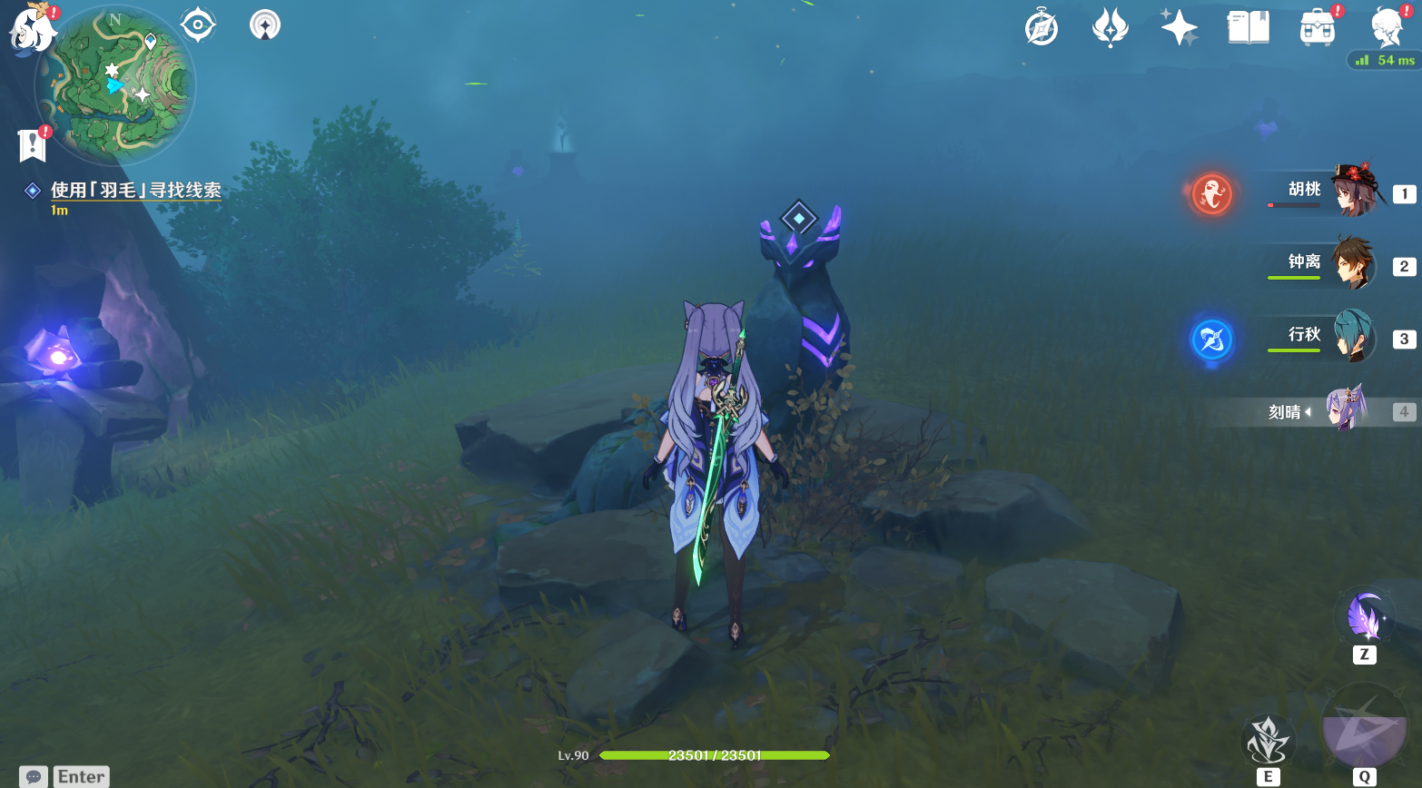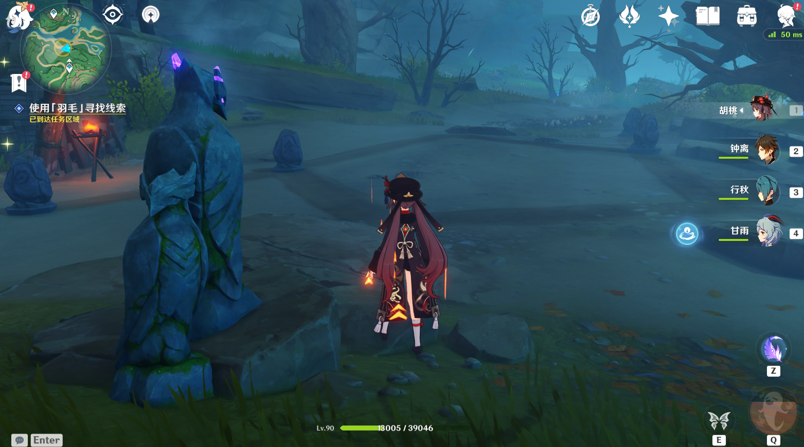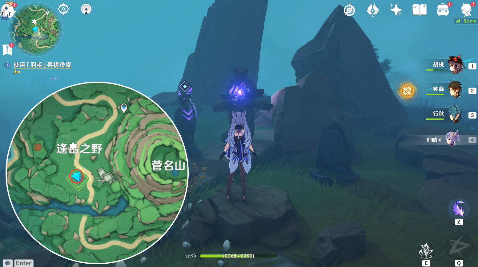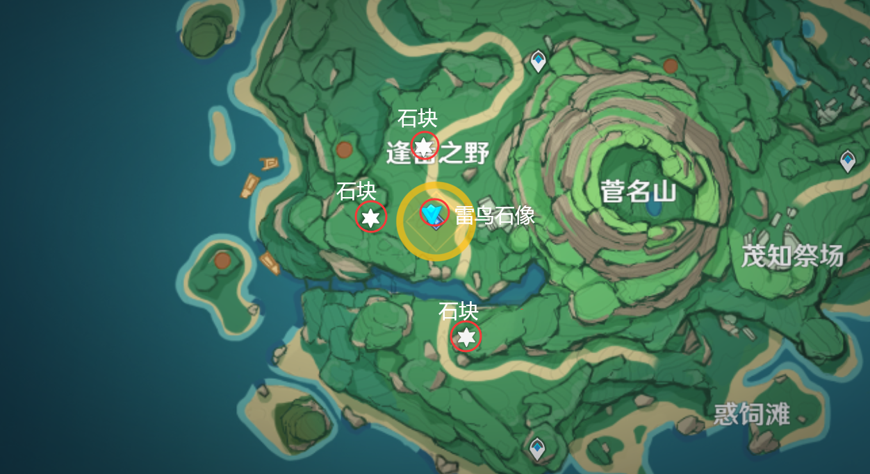7.前往逢岳之野,这里有迷雾,需要用雷元素点亮旁边的雷灯,不然会迷失;走近雷鸟石像使用羽毛寻找线索,与阿瑠对话,