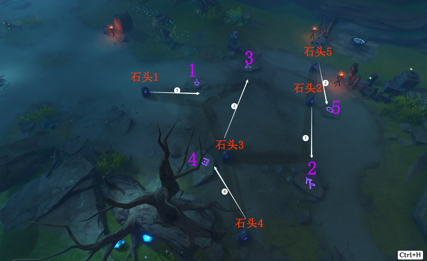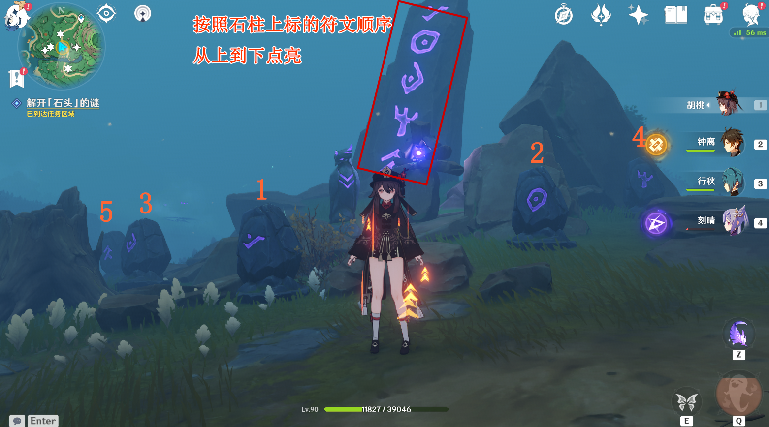 10.石头归位后,仙灵会消失并出现石头符文。按照石柱上符文,从上到下顺序,攻击石块点亮即可破解,如图。