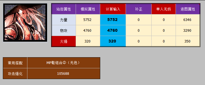拟定MP无色流的组合,词条属性均为1级,属强为320,攻击强化为105688点,左槽无佩戴状态。模拟伤害为115.37亿。