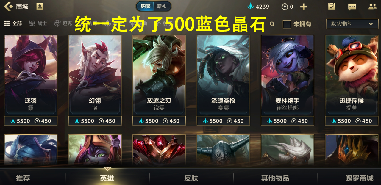 英雄统一价格为5500蓝色晶石
