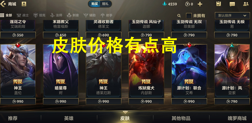 谈完了英雄问题,我们就来谈谈皮肤的问题。很多玩家认为手游中的皮肤要比端游便宜,但是其实并不是这样的,手游中的皮肤同样不便宜。比如部分源计划系列的皮肤价格为790点券、剑圣的御剑传说需要790点券、神王德莱厄斯需要990点券、艾希的源计划皮肤甚至要990点券。说实话,这皮肤的价格是有点高了,很多玩家们其实并不理解这样的低价。