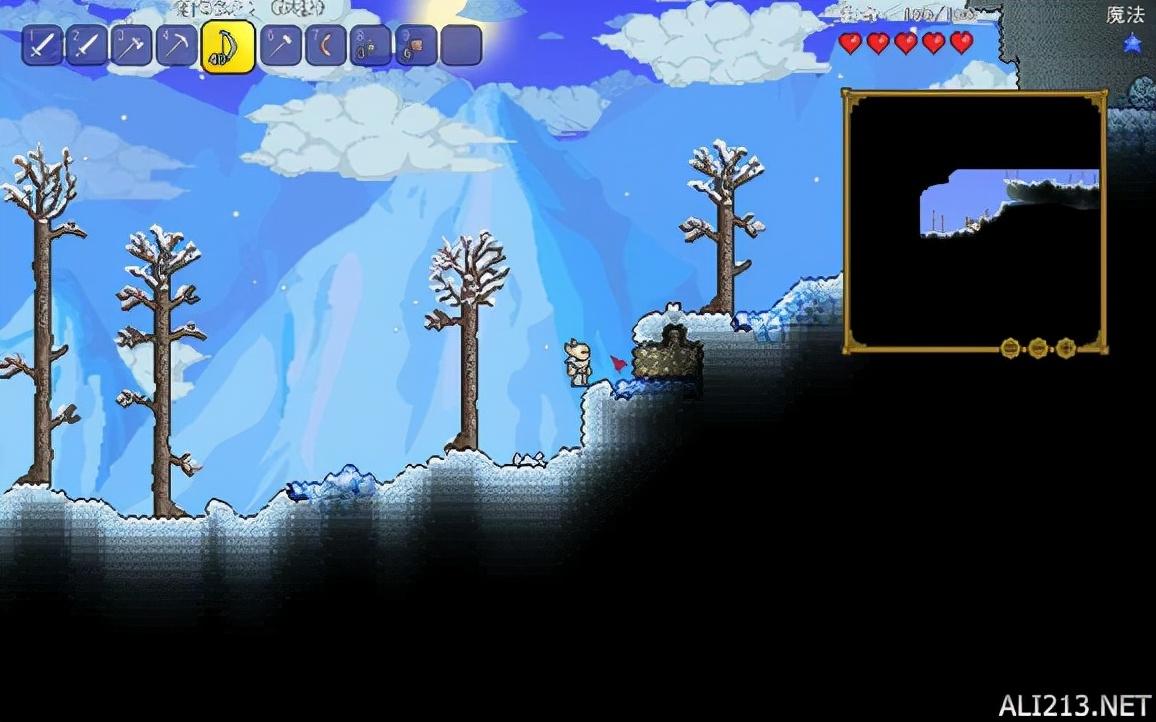 下矿辛辛苦苦打造了一套银套装,这种地方叫雪原,全是冰和雪,少有植被或土壤。前期特殊生物有企鹅,爱斯基摩僵尸,冰霜史莱姆。树木没什么特殊的。就长的不一样,砍下了都是木材。地下的宝箱均为冰霜宝箱及少量黄金宝箱。