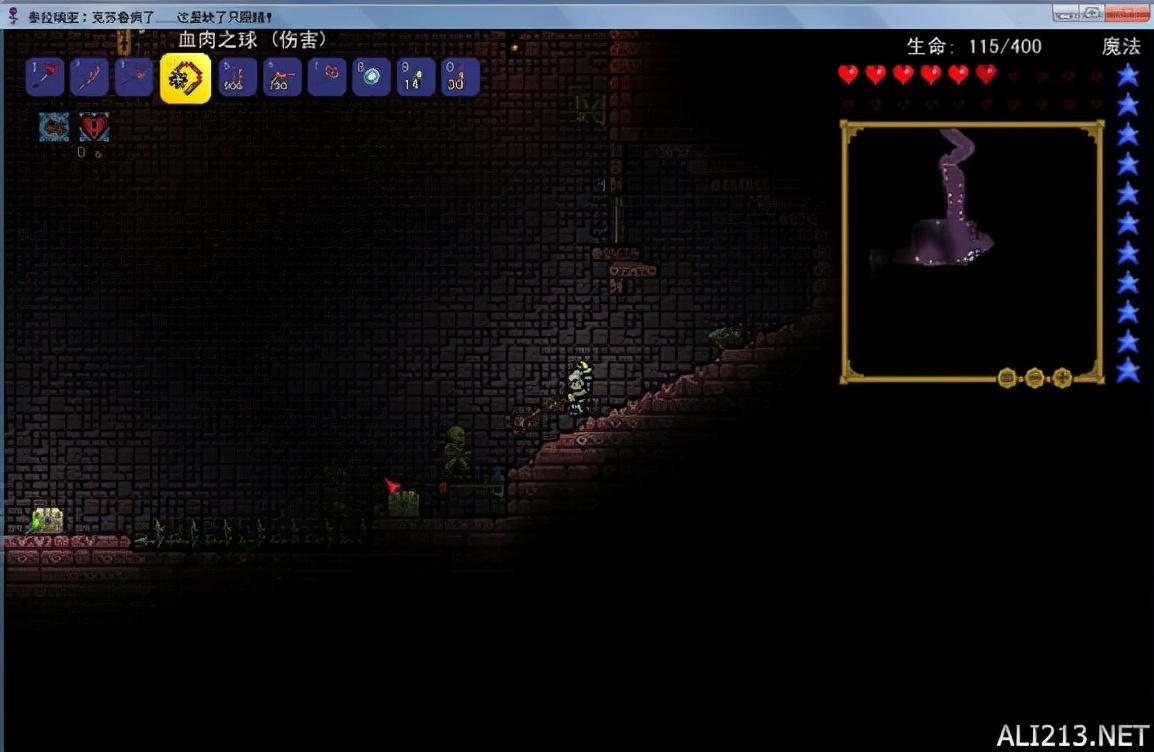 深入血腥之地(一个世界中血腥之地和腐化之地只能有一个)....人品真不错,身边有两个生命水晶,可惜血已经上限了。生命水晶旁边的一坨眼球是恶魔祭坛啊,再问砍手。血腥之地是个很可怕的地方。有红色植被覆盖,上有阴影木(黑灰色,造木剑攻击力为10)花纹还挺漂亮的,前期特殊生物有血肉之虫,巨脸怪,鲜血蜘蛛。血肉之虫有大中小三种,大的血有120,中等血有60,小的只有45。会飞,咬你一口伤害15左右。