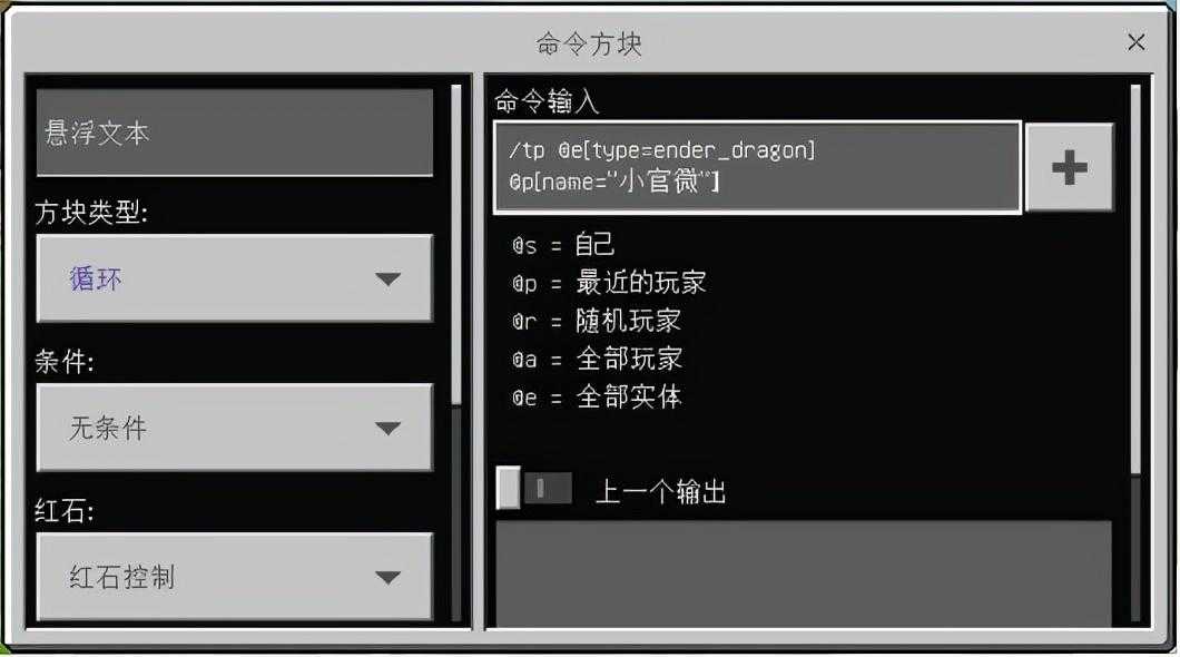 然后将1号命令方块中的指令修改为/tp @e[type=ender_dragon] @p[name="方块菌"],其他条件保持不变。