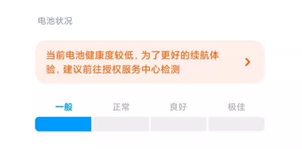“当前电池健康度较低,为了更好的续航体验,建议前往授权服务中心检测”
