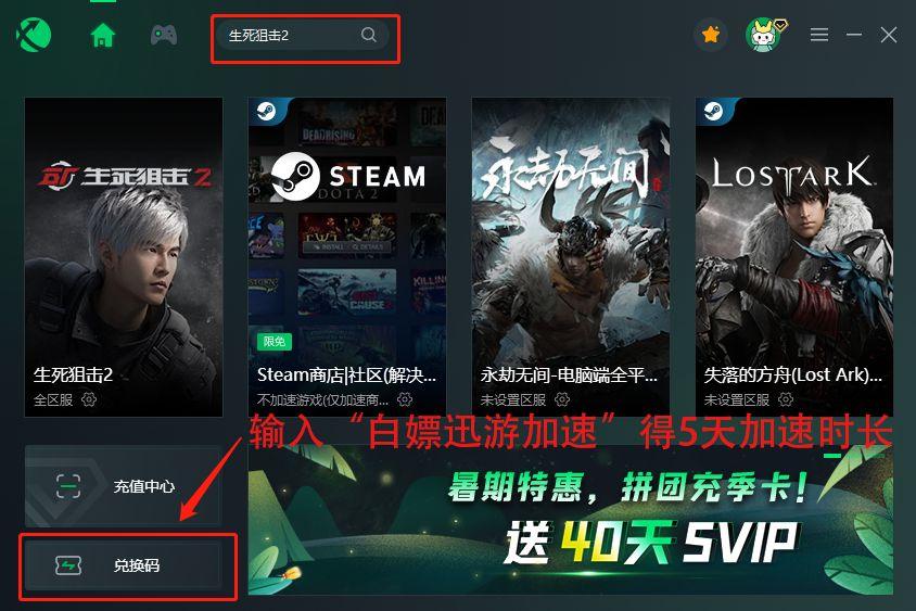 很多小伙伴反映在游戏中遇到下载速度非常慢以及游戏延迟很高的问题,下载迅游,客户端左下角输入【白嫖迅游加速】,兑换5天加速时长后,选择生死狙击2进行加速即可解决下载慢游戏延迟高等网络问题。
