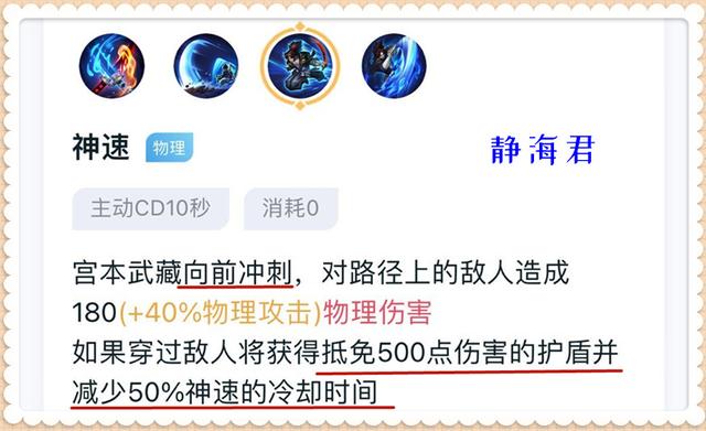 宫本武藏二技能的核心关键词是:冲刺、护盾和技能缩减。
