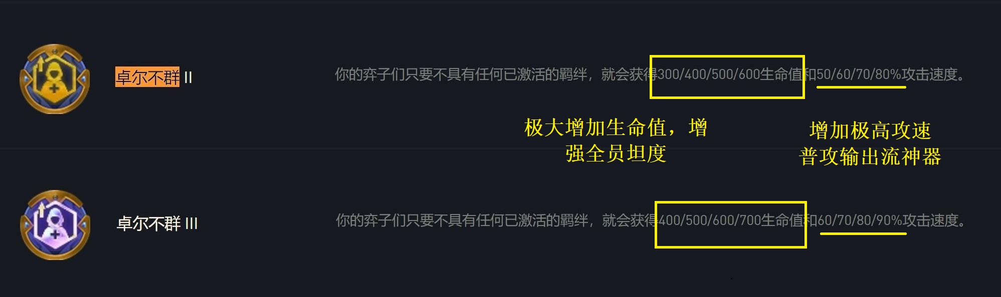 拿金色卓尔不群举例,卓尔不群最多增加600生命值,而格斗加6羁绊才增加450生命值,600生命值对阵容坦度提升巨大,而攻速方面更是最多可增加80%攻速,这让阵容普攻速度大大加快 ,单位时间内的输出伤害大大增加,另一方面攻速增加就代表着回蓝加快,技能释放频率 也会大大增加。