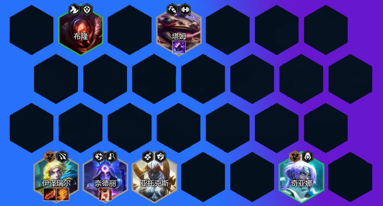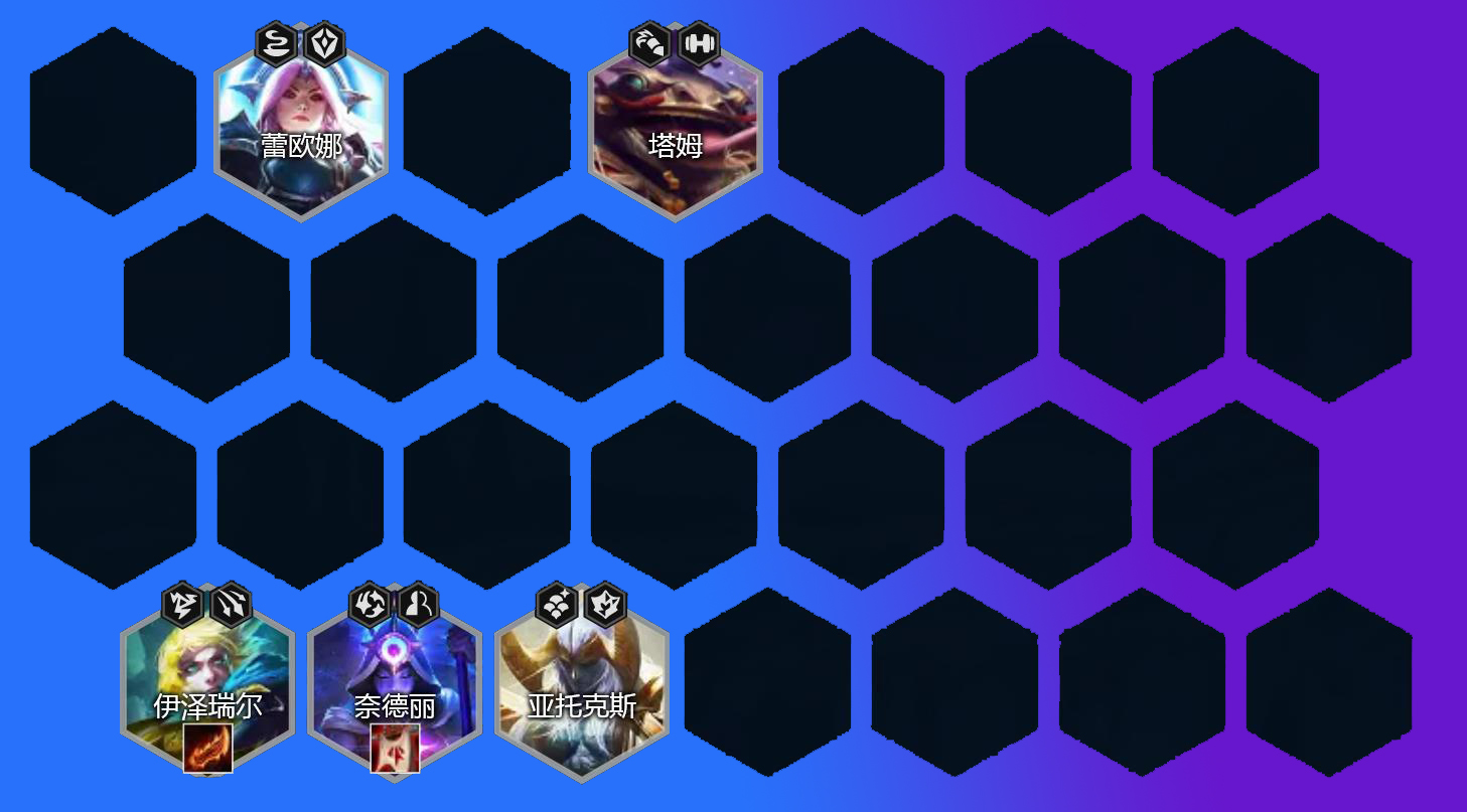2-1升4、2-5升5,上强势单卡,追求连胜,1费比较强势的Ez、塔姆、蕾欧娜、奈德丽、亚托克斯、弗拉基米尔这几个最强。装备上有啥合成啥,羊刀、电刀巨杀、正义、日炎、传送门、基克都可看情况上就好,2星优先。