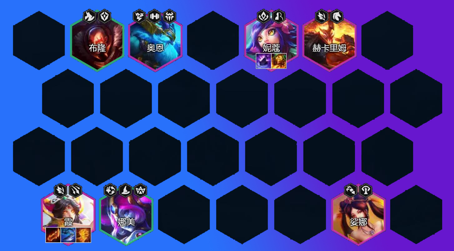 这套阵容就搭配了奥恩、娑娜、赫卡里姆、妮蔻、亚索与巴德6大群控棋子,阵容的控制能力简直逆天 ,对局中敌方大部分棋子大部分时候均在眩晕中,在辅以高费卡的强度,平推敌方。