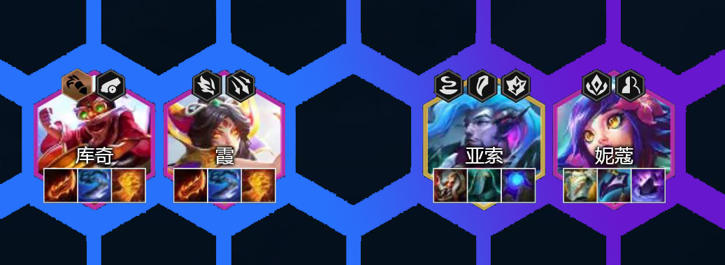 这套阵容C位可考虑4费的库奇与霞,5费C位可选择亚索。这3枚棋子特别吃攻速,只要攻速够快,输出强度就能得到史诗级提升。