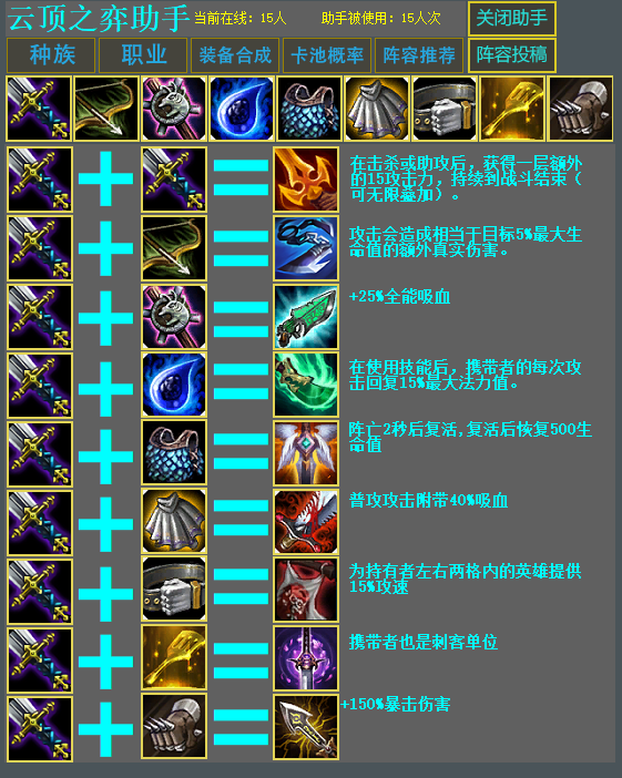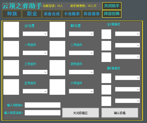 功能如图里,本助手采用云端获取阵容,这样游戏更新我也好更新,而且大家的使用体验也会好很多